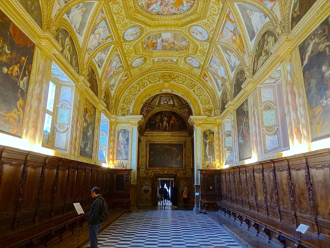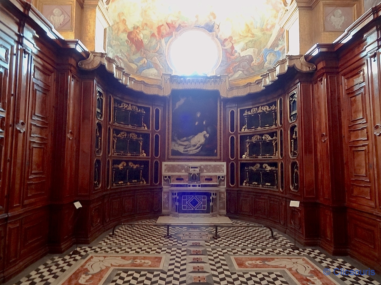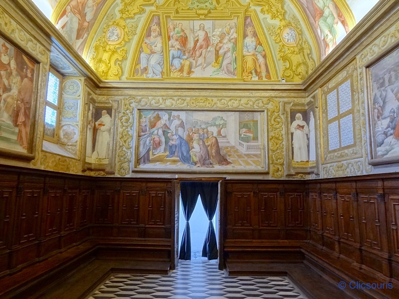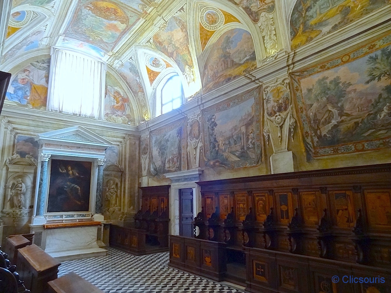 Je me suis régalée à arpenter les salles qui l’entourent ! Toutes sont ornées de superbes fresques, et mention spéciale à la sacristie, avec ses armoires de marqueterie de bois très finement sculpté ! J’ai vraiment aimé.