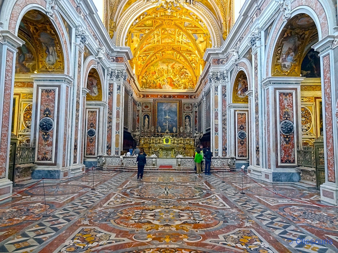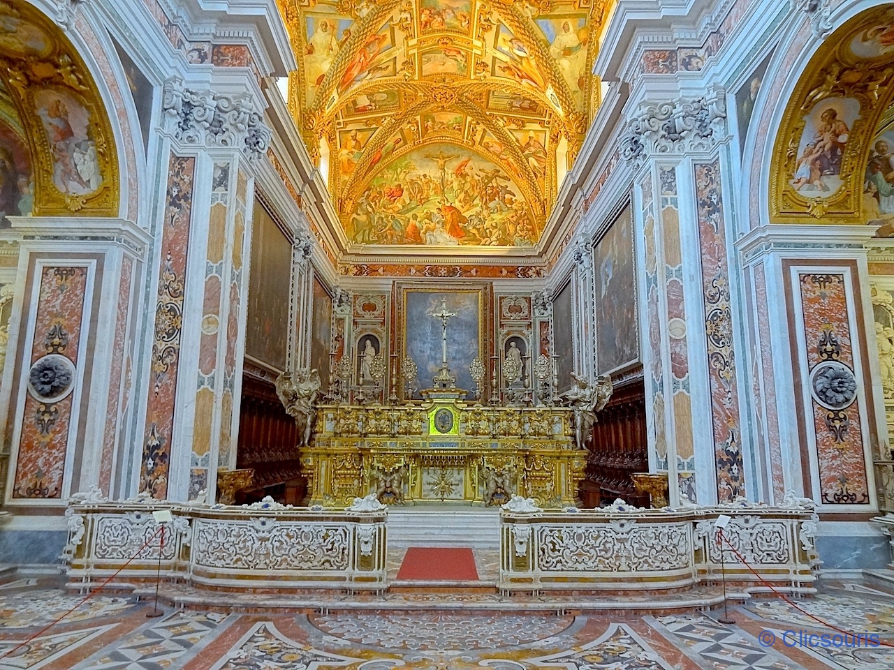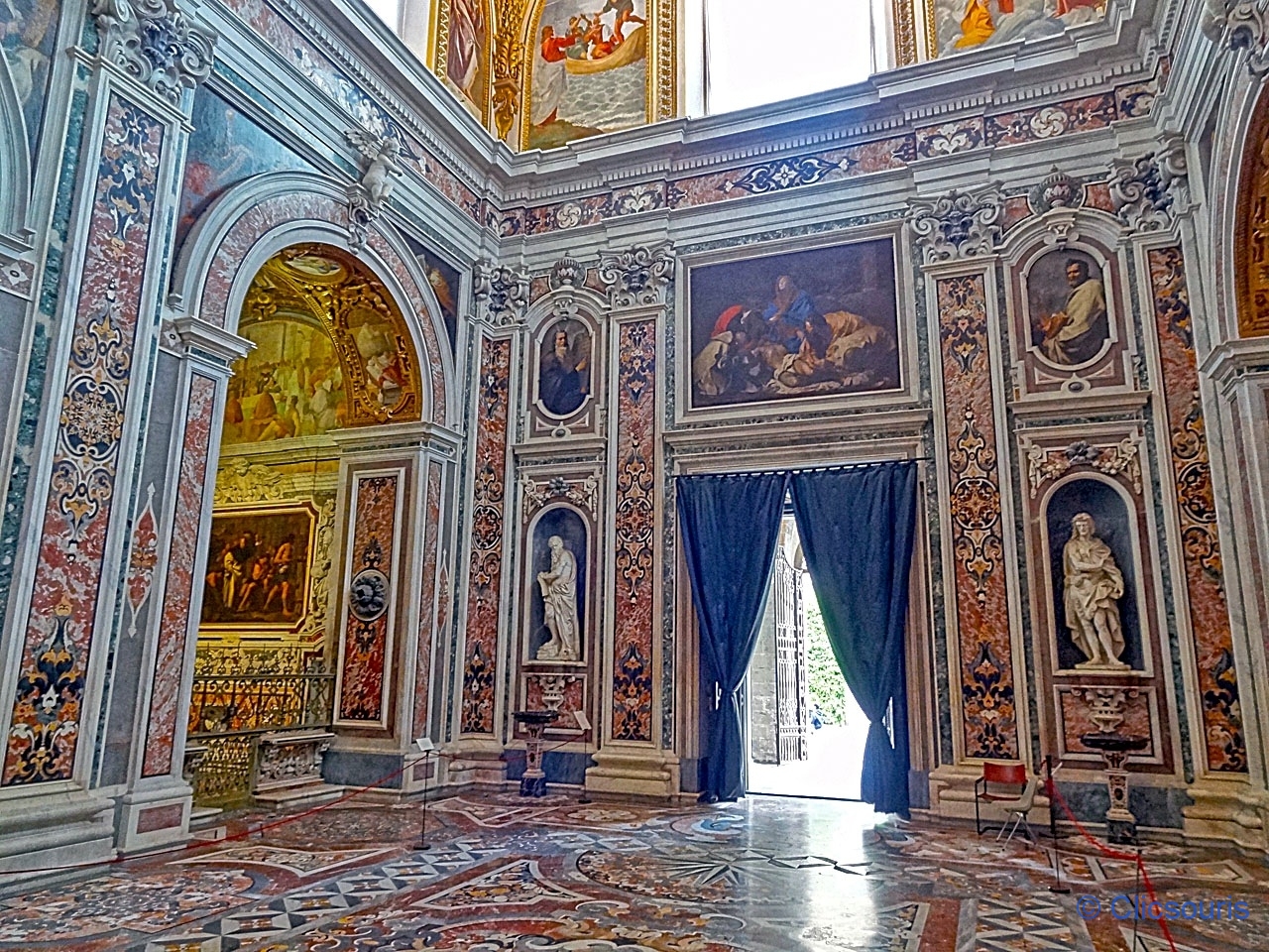 Les chapelles latérales abritent de belles œuvres d’art, et on ne peut qu’apprécier la finesse de la marqueterie de marbres polychromes. Vraiment très belle, le genre d’église que j’aime bien (et oui, pas fan de sobriété, hum).