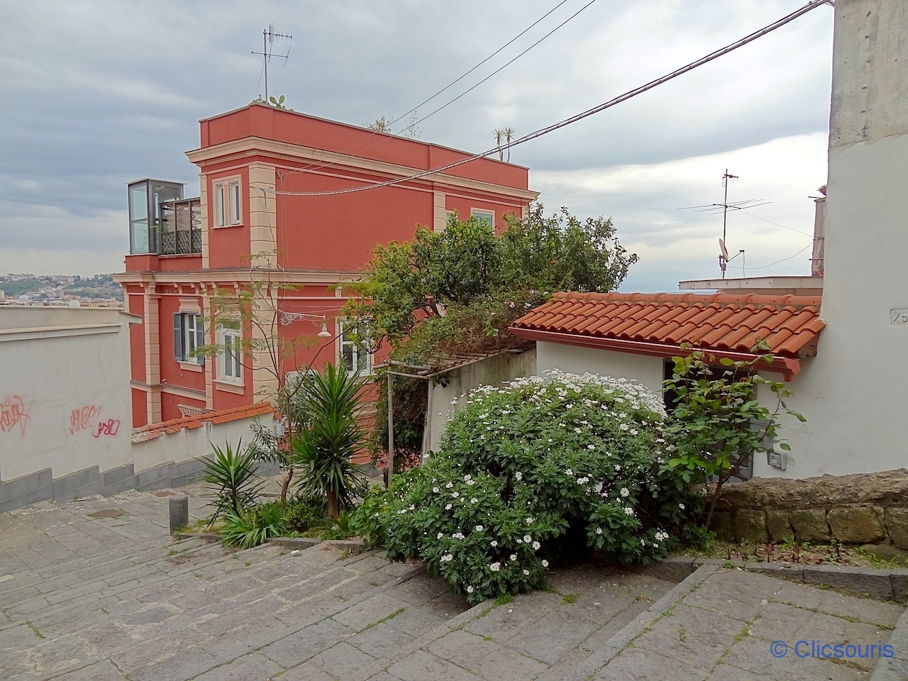 C’est malheureusement à chaque fois sous un ciel gris que nous avons découvert le quartier du Vomero, pas de chance ! Dans ce quartier bourgeois, tout semble propret et bien repeint, à mille lieux des ruelles de la vieille ville de Naples… qui ne sont pourtant pas si loin !