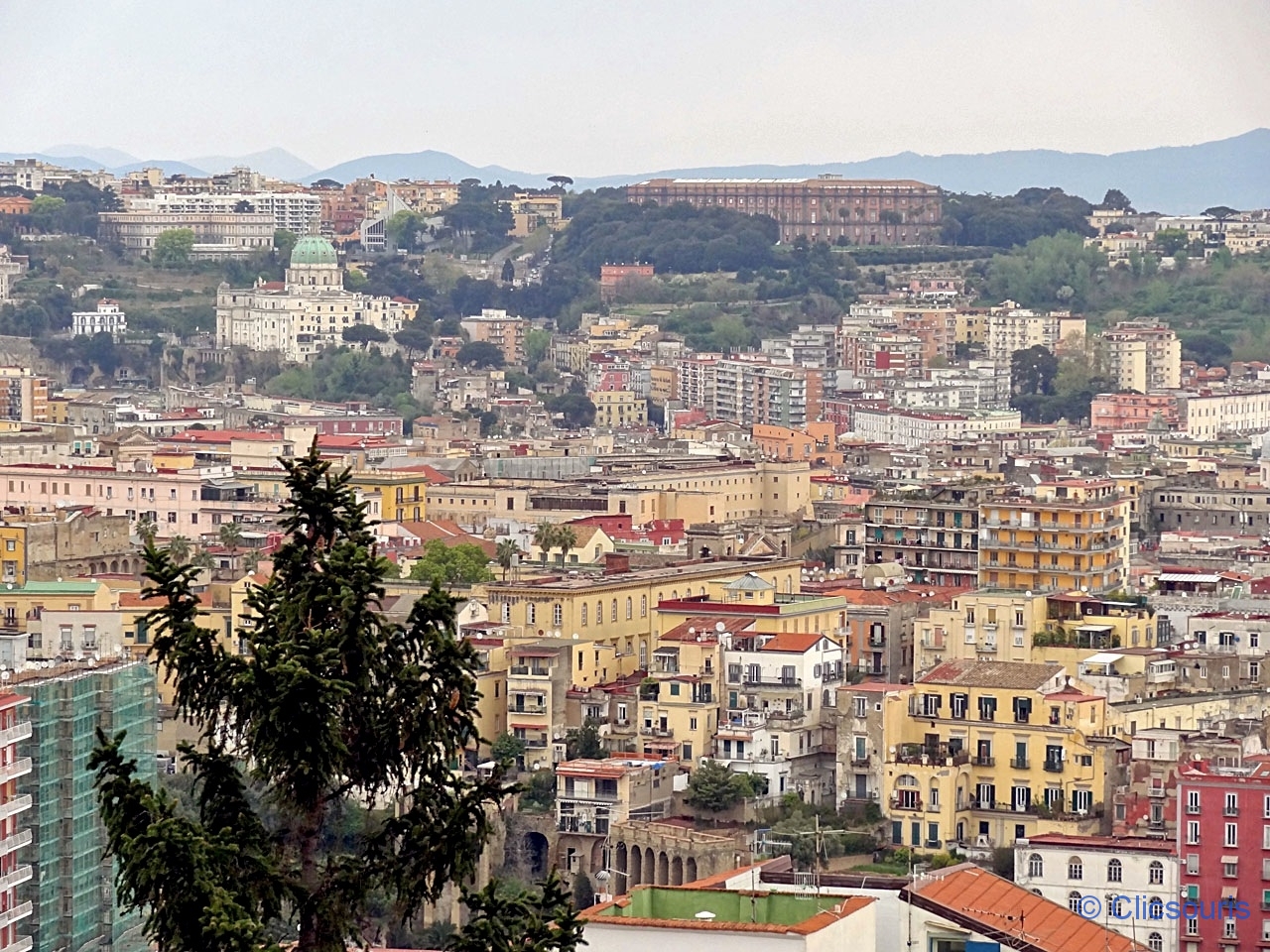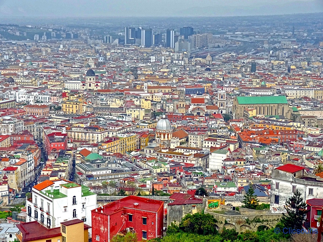 On aperçoit plusieurs églises, la gare et le quartier d’affaires avec ses tours modernes, au loin le Vésuve en toile de fond… Mais également le grand musée de Capodimonte ainsi que ses jardins, situés sur une colline dominant elle aussi la ville.
